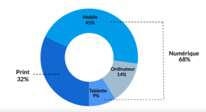 Cette crise de la presse quotidienne en France est aussi la conséquence de la multiplication des supports de diffusion, ainsi que des changements majeurs dans ls pratiques de consommation de l’information au sein de la population. En effet, selon une étude de l’Association pour les chiffres de la presse et des médias datée du 21 janvier 2021, 68% des français lisent la presse uniquement sur le web (smartphone, ordinateur, tablette). Le smartphone est le support le plus prisé, avec 41% des personnes interrogées qui déclarent n’utiliser que ce moyen d’information. Plus généralement, 82,9% des Français lisent au moins une marque de presse en version numérique par mois, ce qui représente 43,7 millions d’individus.